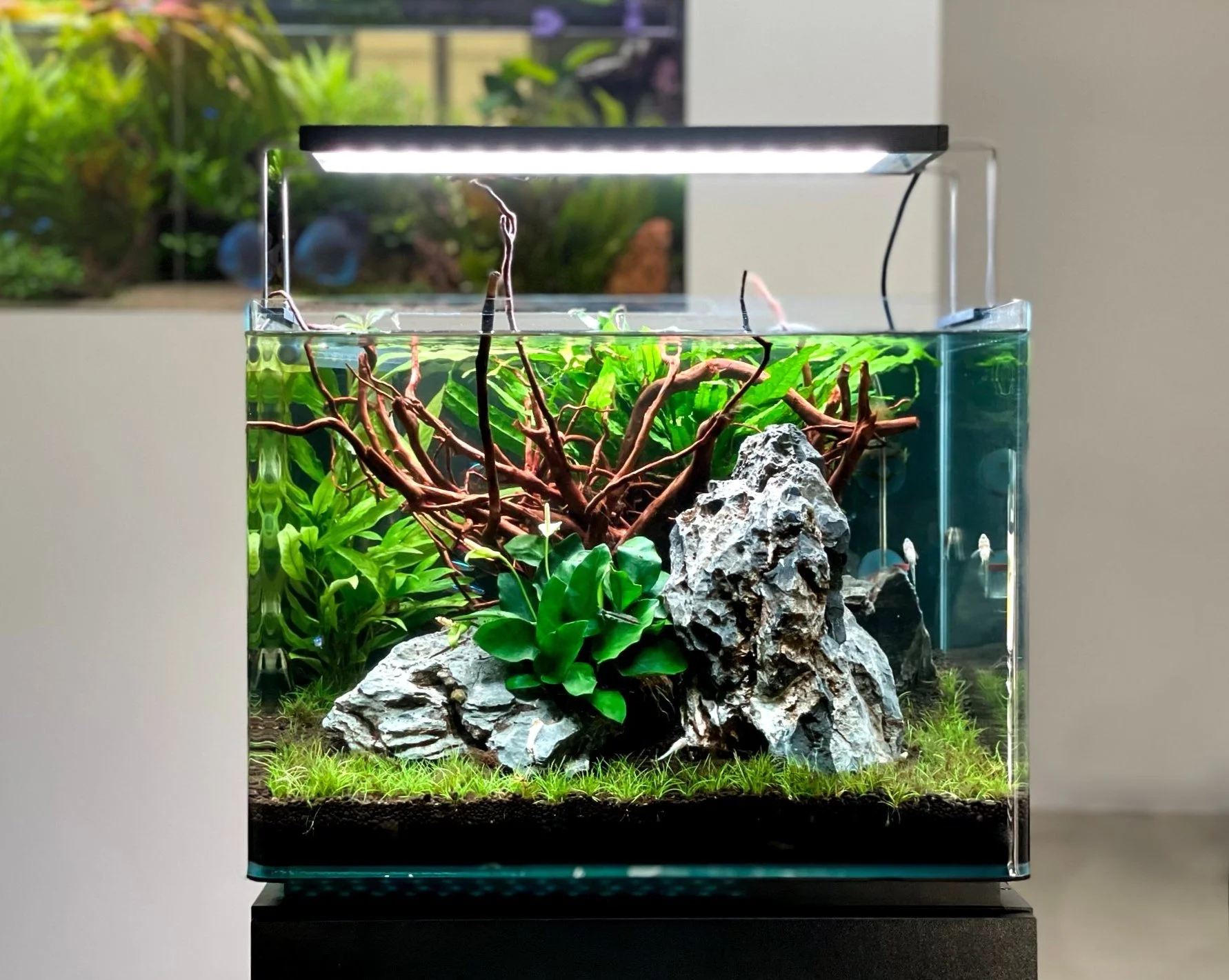 Unsere Kompaktserie sieht sogar auf kleinstem Platz wunderbar aus. Die eigens konstruierte Tiefenwirkung und der Panorama-Effekt geben dem Aquarium Raumvolumen auf geringster Kubatur.